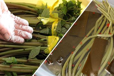 山菜を収穫しながら、田中さんはそう言って笑う。斜面にある山菜を採っているときには、視線はもう次の山菜を見つけている。30分くらい歩いただけで、ひと抱えのワラビやネマガリダケ(チシマザサ)が集まった。その後、湿地を好むミズの収穫に向かった。沢の両側に密集して生えていて、根元の色の違いによって赤ミズと青ミズがある。今回収穫したのは赤ミズで、根元の赤い部分を包丁の背でたたくと“とろろ風”に味わえるという。